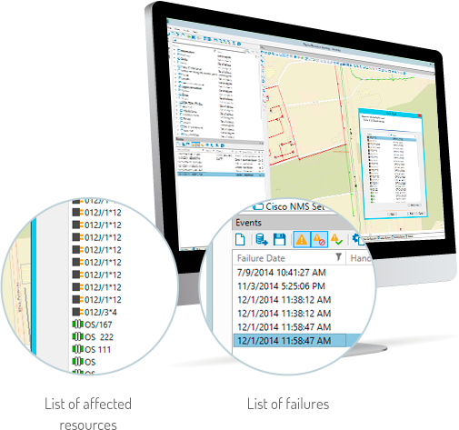 - Определяет зону влияния сбоев и визуализирует их воздействие на сеть и, при наличии связей с сервисным уровнем, на услуги конечных пользователей.